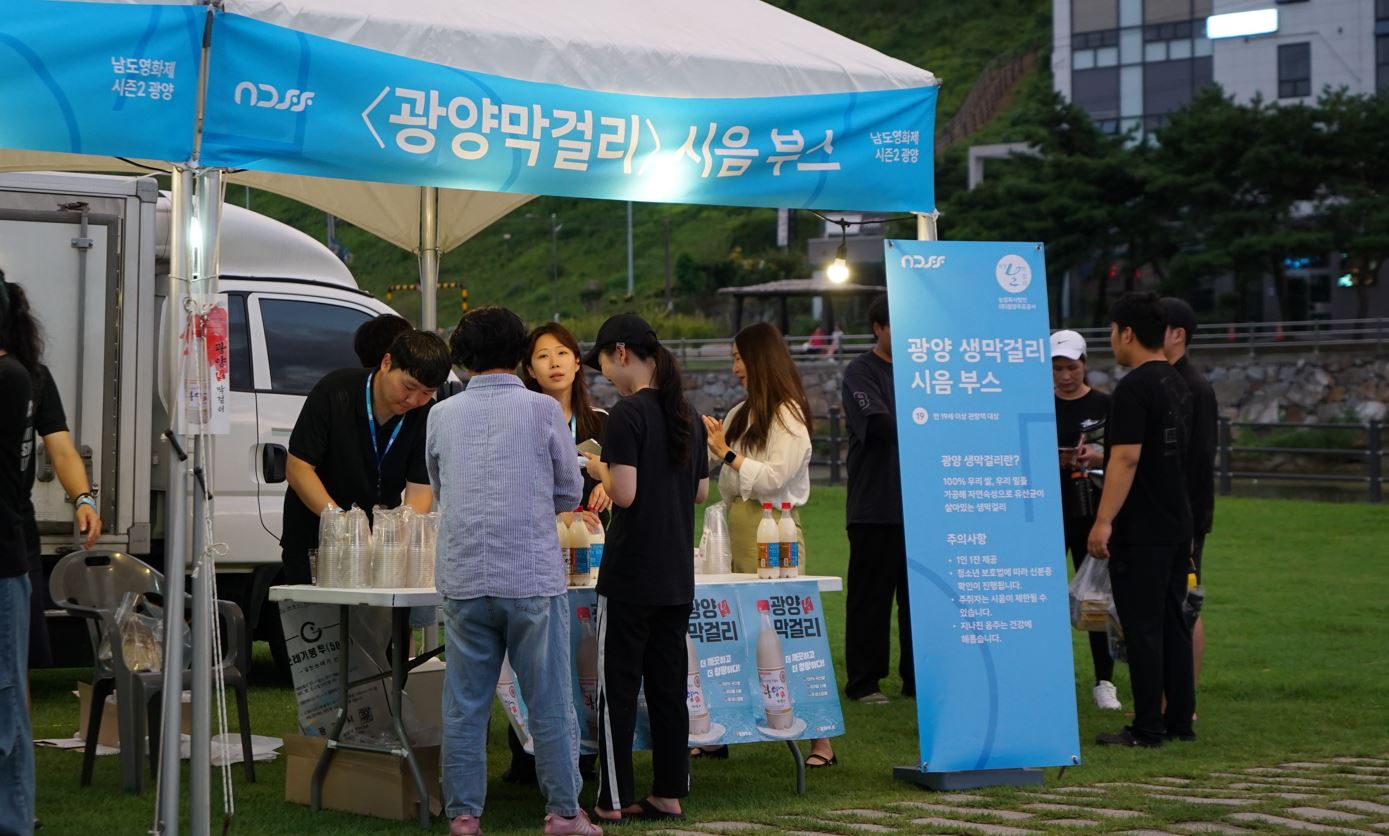 일명 ‘빨간 뚜껑’으로 불리며 시민들의 사랑을 받아온 광양 생막걸리가 남도영화제를 찾아와 무료 시음회를 열었습니다. 특별히, 남도영화제가 광양 생막걸리의 라벨을 채우며 병을 받는 순간부터 영화제를 만나는 즐거움을 선사했는데요. 빨간 뚜껑을 열기 전부터 눈에 띄는 파란 라벨 덕분에 막걸리가 영화제의 기념품처럼 느껴지기도 했습니다.